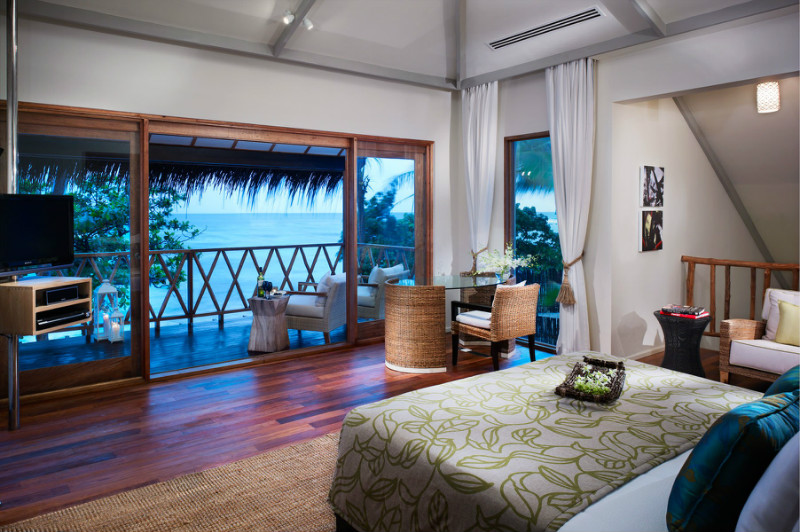 16间豪华沙滩别墅Deluxe Beach Villa(66 m2):异国情调的成熟与茅草顶屋,大玻璃窗台炫耀惊人的海滩景色。房间设施