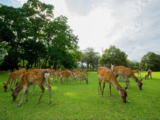 【奈良公园】(约60分钟)位于奈良市街的东边,东西长4公里、南北宽2公里,面积广阔,若草山、东大寺、春日大社、国立博物馆等奈良的名胜古迹大多在这里。在明治21年(1888年)成为县立公园,是日本现代公园的先驱之一。大正11年(1922年)被指定为日本的国家名胜。成群嬉戏于公园里的鹿,因与春日大社流传的白鹿传说有关而受到保护,且被指定为国家的自然保护动物。享受这美丽的大自然最好是在碧绿的若草山和鹿毛色美的4、5月,或是满山红叶的秋天等出游行乐、毕业旅行的季节。一年四季无论何时,这里都有吸引人的景观。。道路两旁,枫叶迎风招展,在和熙阳光的照耀下,如霞似火,发出悦耳的飒飒声音,绿色的草萍上、道路上,铺满了从树上飘逸下来的五彩缤纷、形状各异的落叶,犹如一幅巨大的水彩画,令人悦目舒心。据说奈良在近1300年前已建成平城京,后来日本首都迁往不远的京都再迁往东京,而奈良竟不曾衰败过。秋天的奈良公园以大片鲜艳的红色,招呼着我们投进它的怀抱。走进林子,踩着红叶,邂逅小鹿、行人、画家,还有属于世界遗产的东大寺,诉说日本秋天最浪漫的神话。其中有1200头鹿生活在这里,这些鹿大多温顺而讨人喜爱。