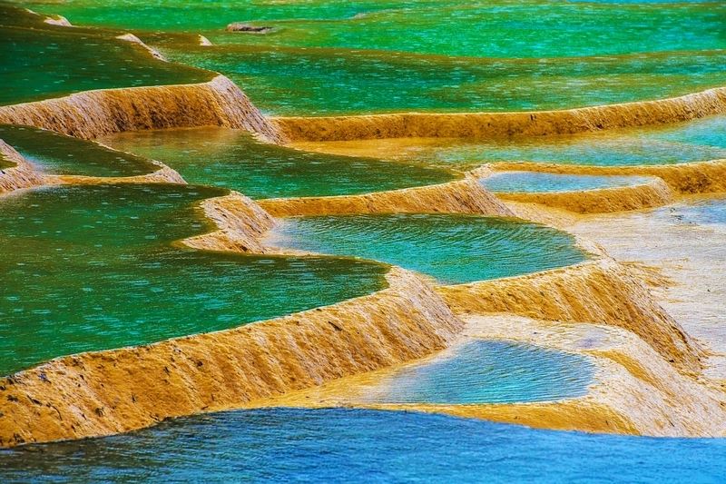 池形态各异,流光泛彩,长达2500 米的钙化硫池是世界之